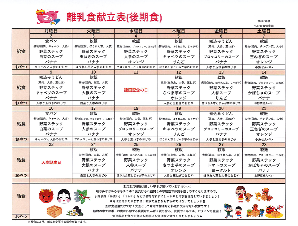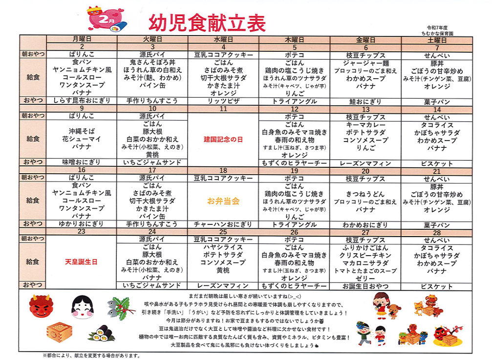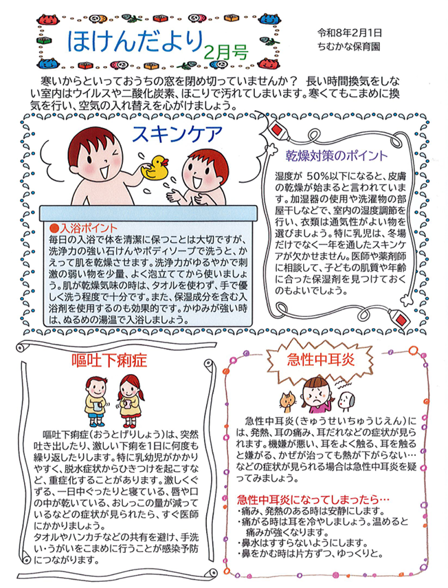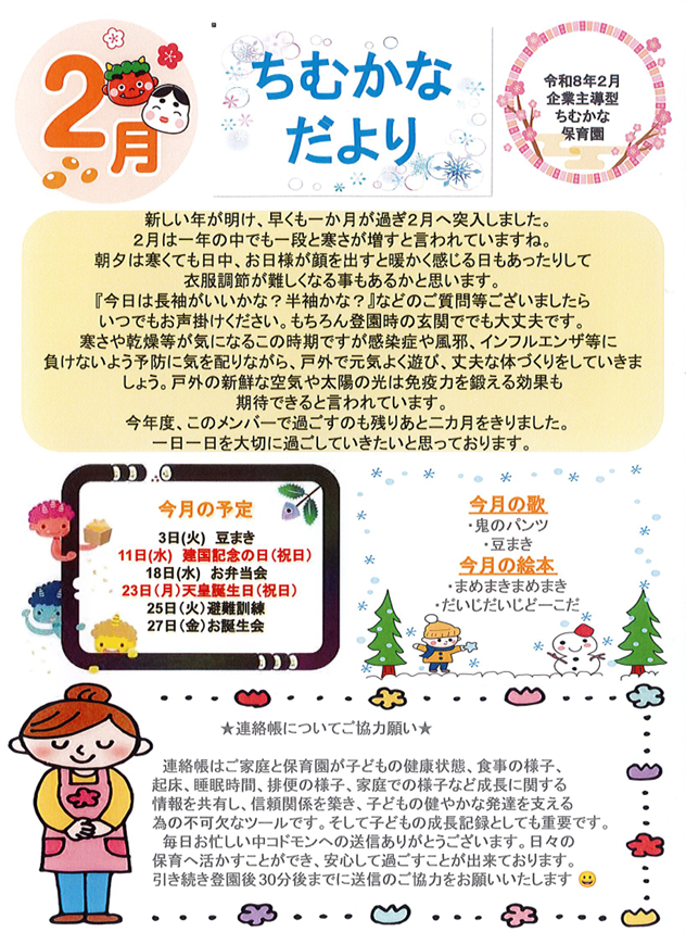 ちむかなだより!2月号発信! お知らせ皆さんこんにちは!ちむかな保育園です‼ いつも温かいご支援ありがとうございます✨ ちむかなだよりと献立と保健だよりをお届けいたします! 2026.01.31 皆さんこんにちは!ちむかな保育園です‼ いつも温かいご支援ありがとうございます✨ ちむかなだよりと献立と保健だよりをお届けいたします! 咳や鼻水などの症状が見られる子が多くなっております。 園の方でも体調管理に気を付けて保育にあたりたいと思います! 今年度も残り二カ月となりましたが引き続きよろしくお願い致します(´▽`*)